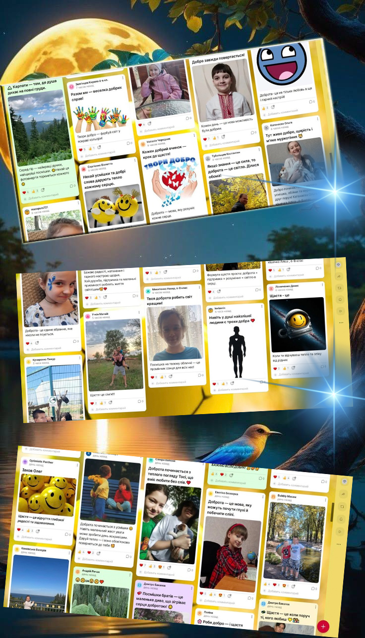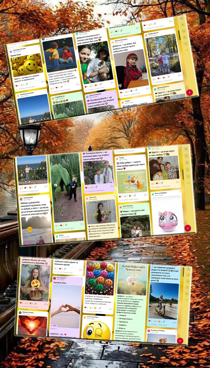 Мета акції — поширити доброту, тепло й позитивні емоції серед усіх учасників шкільної спільноти. На онлайн-дошці Padlet “Стіна доброти” розміщали фото з усмішками, веселими моментами чи обіймами з друзями та рідними, компліменти та добрі побажання.